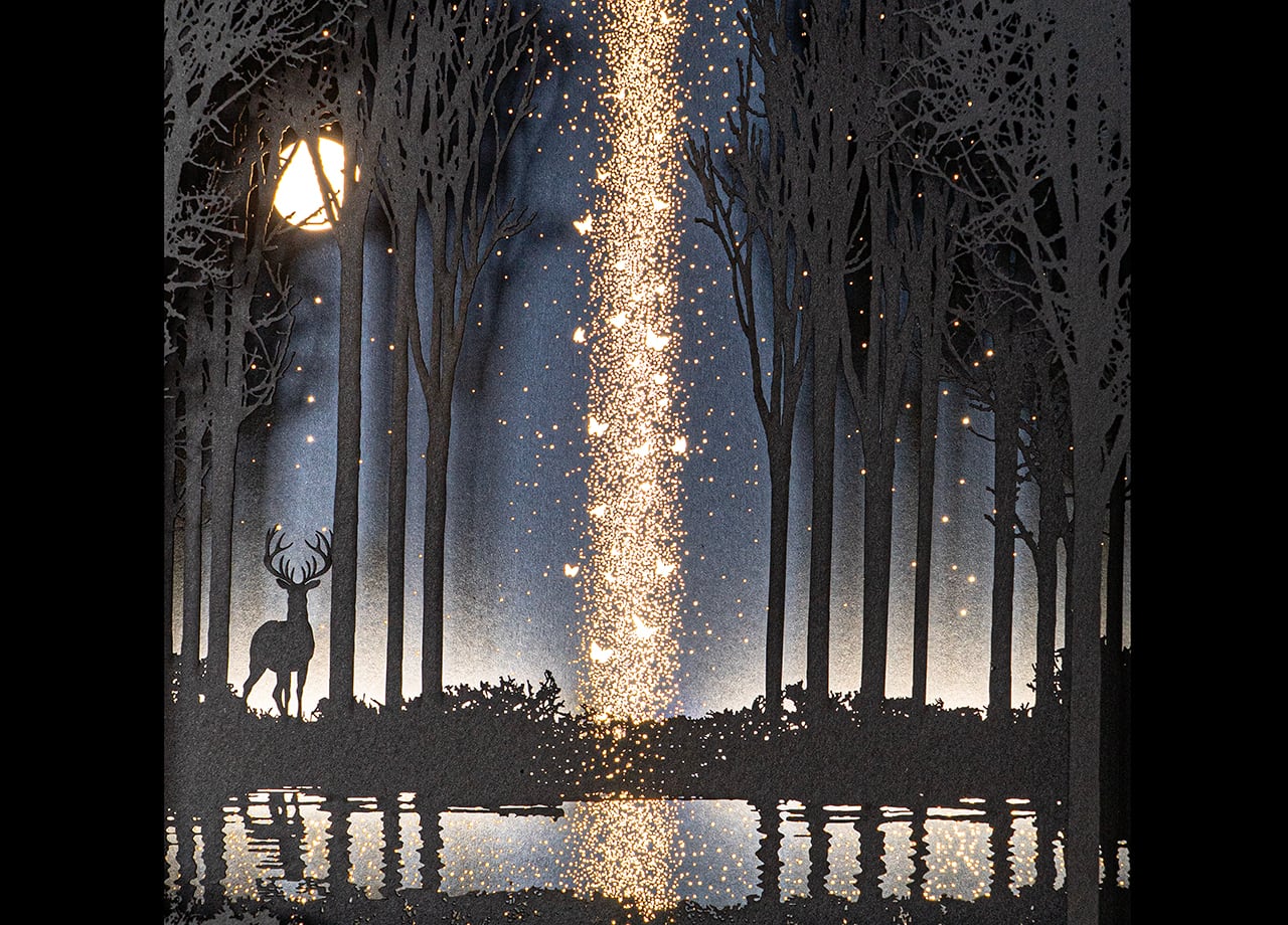 作品の物語:奥深い森の泉に星の雫(しずく)が降り注ぎ、光で浮かび上がる。神秘的な光景を繊細なシルエットで表現したライトアート作品。