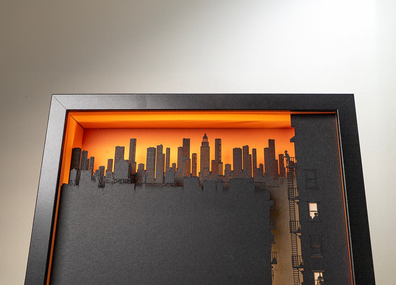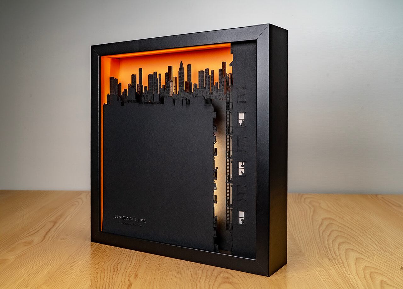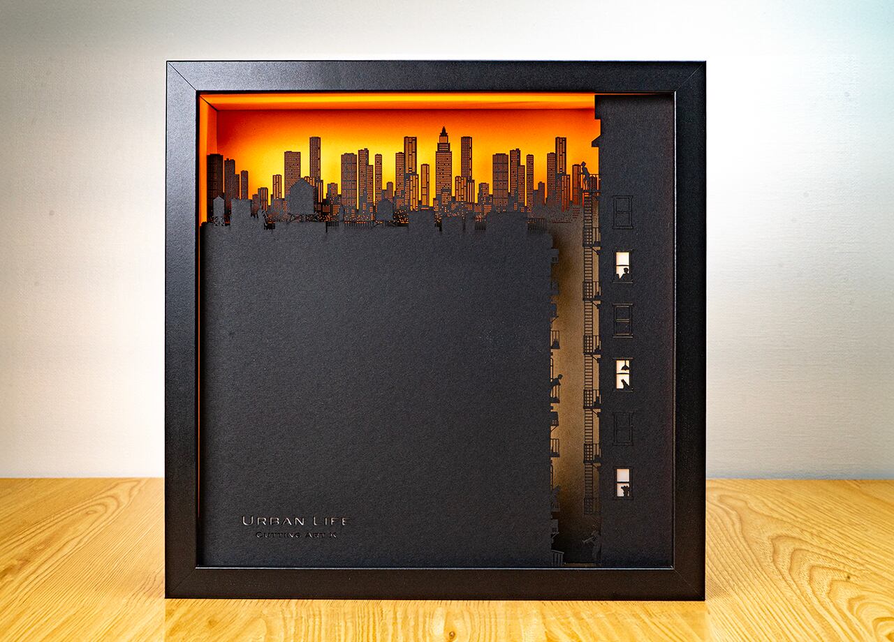 作品の物語:夕暮時の大都会。摩天楼のようにそびえる高層ビル群を背景に、都会で暮らす人々をミニチュアジオラマのような繊細なシルエットで表現。インテリアのアクセントにナイトライトとしても機能するライトアート作品。
