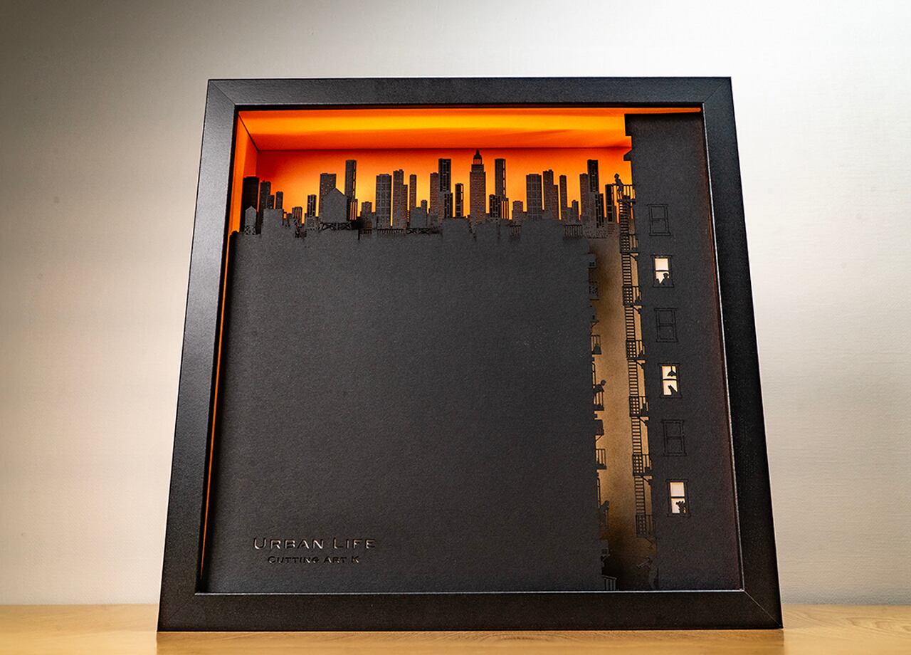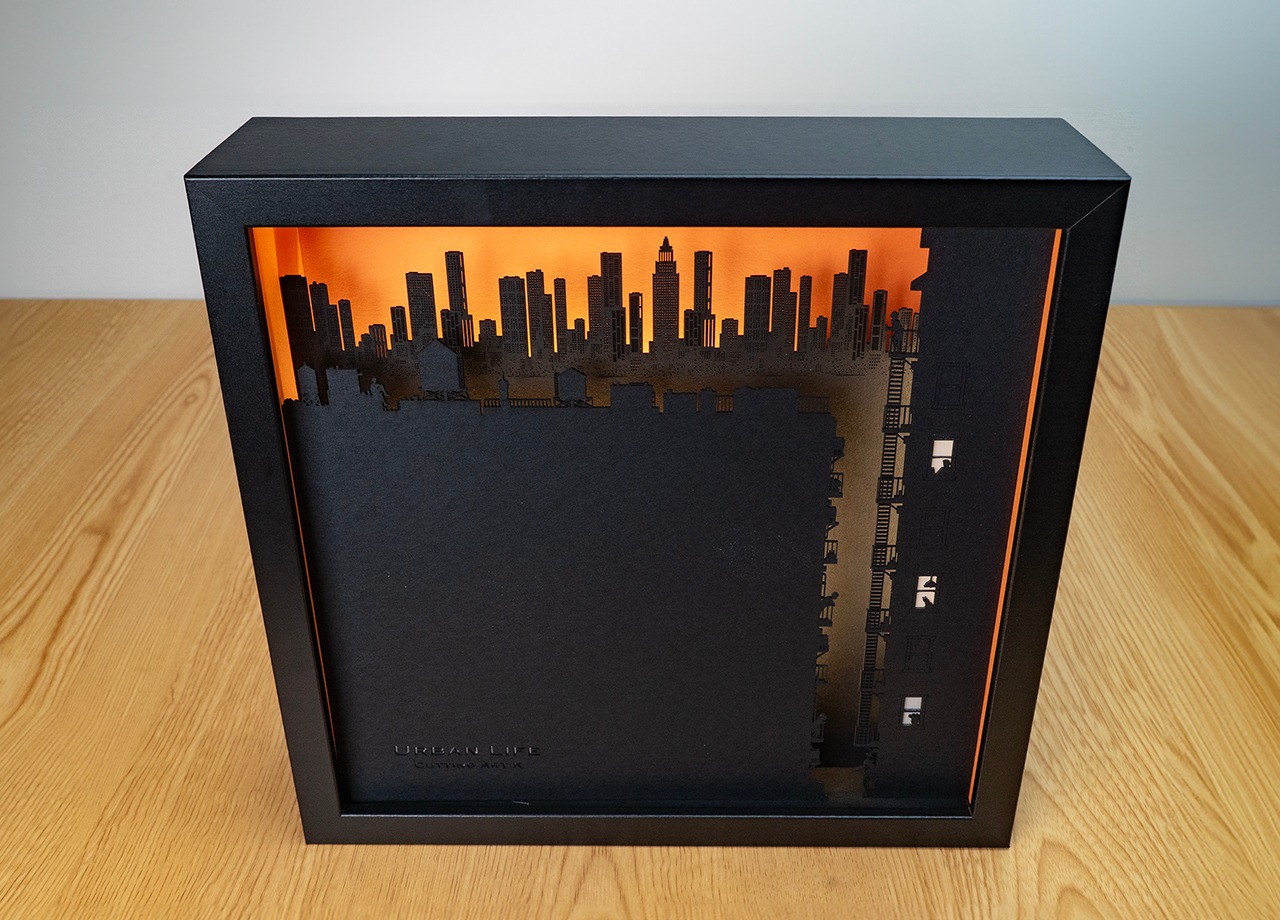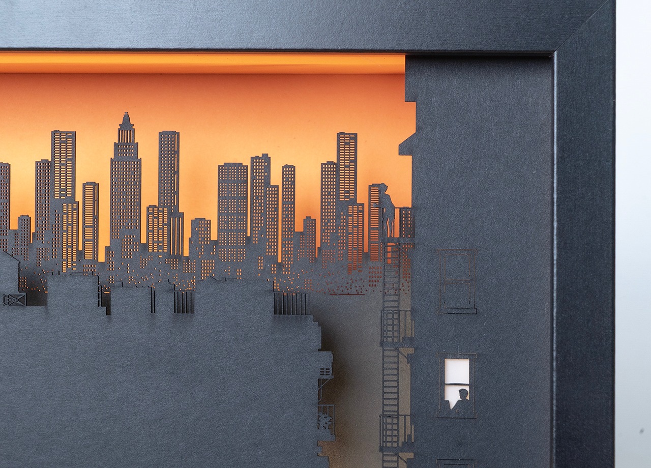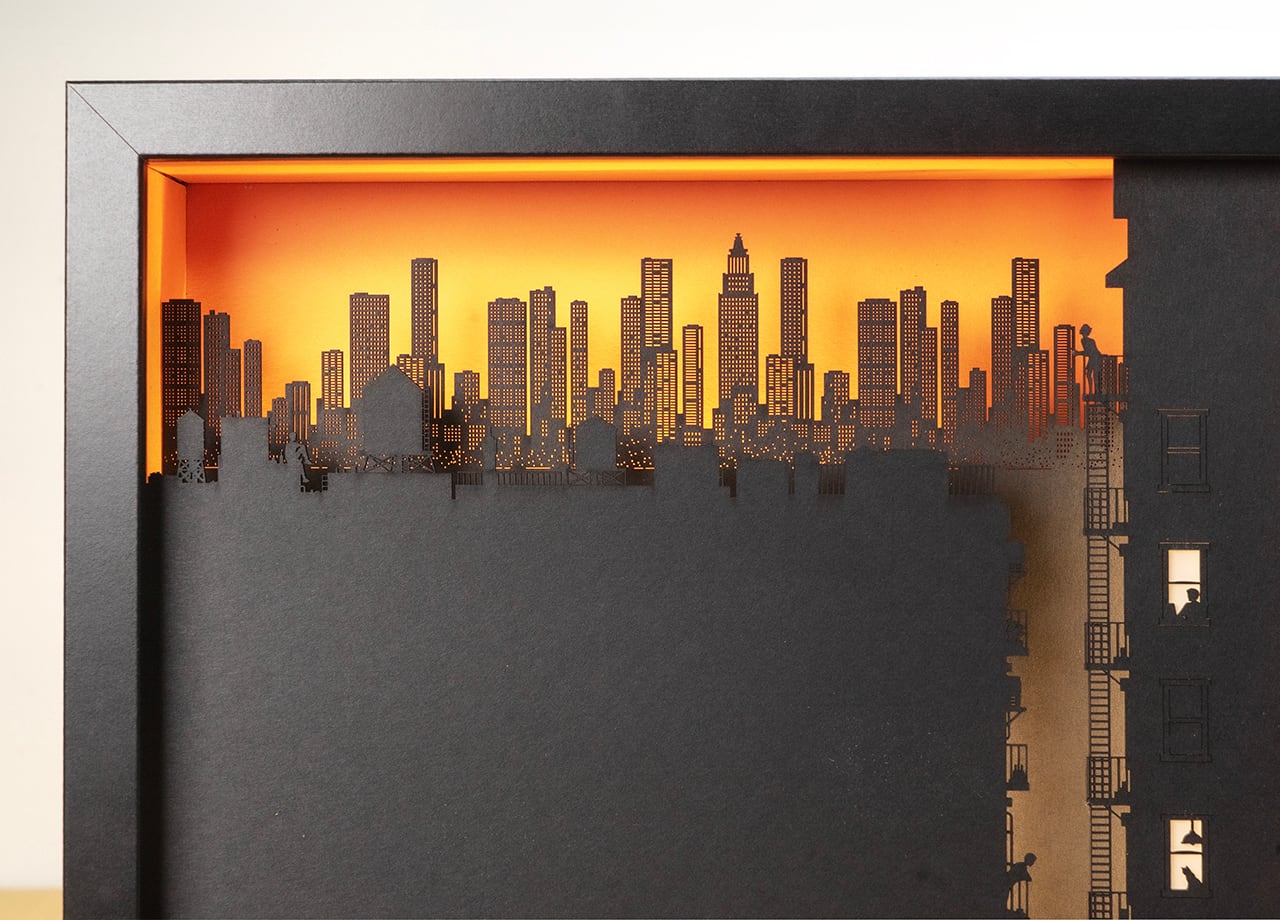 作品の物語:夕暮時の大都会。摩天楼のようにそびえる高層ビル群を背景に、都会で暮らす人々をミニチュアジオラマのような繊細なシルエットで表現。インテリアのアクセントにナイトライトとしても機能するライトアート作品。